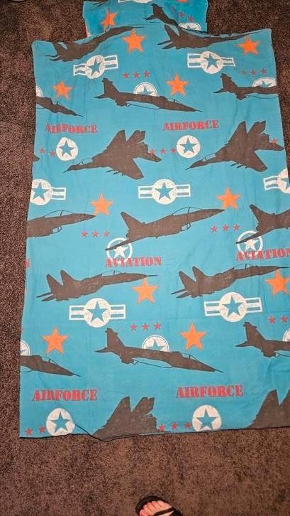 Het dekbedovertrek met blauwe kleur en vliegtuigen ziet er prachtig uit.
