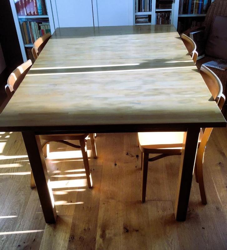 Zeer stevige blank houten tafel (gelakt met blanke lak) van Ikea. Degelijk materiaal, we hebben er jarenlang veel plezier van gehad.