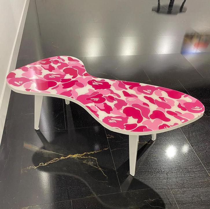 Deze opvallende salontafel in Ape Camo-stijl is een echte blikvanger in elk modern interieur. De tafel is professioneel afgegoten met een transparante epoxylaag, wat zorgt voor een glad, glanzend en duurzaam oppervlak met een luxe uitstraling.