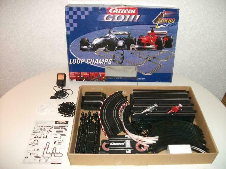 Ook leverbaar in nette staat (lichte gebruikerssporen zonder dat dit invloed heeft op de werking van de racebaan) voor 34.99 Euro de Loop Champs baan van 14.7 meter (de grootste baan ooit gemaakt in het Go assortiment, tegenwoordig leveren ze alleen banen van max. 9.0 meter) met de dikke veel zwaardere trafo (een baan die nog maar zelden in deze staat met orginele doos vind) met loopings, kruiswissels, wegversmalling, schuine wandbocht en met in totaal 66 baandelen, zie fotoos 1 tm 6. Nog 1 set inclusief orginele doos beschikbaar maar de set samenstellen zonder orginele doos kan altijd voor 32.99 Euro.