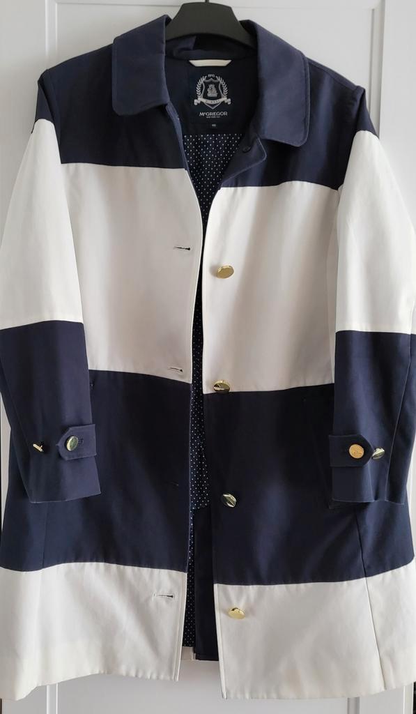 Mooie marinestijl volledig gevoerde tussenjas. Met binnenzak, steekzakken en gouden knopen. Merk: McGregor, maat: 40, kleur: marine blauw wit. Nauwelijks gedragen en in nieuwstaat.