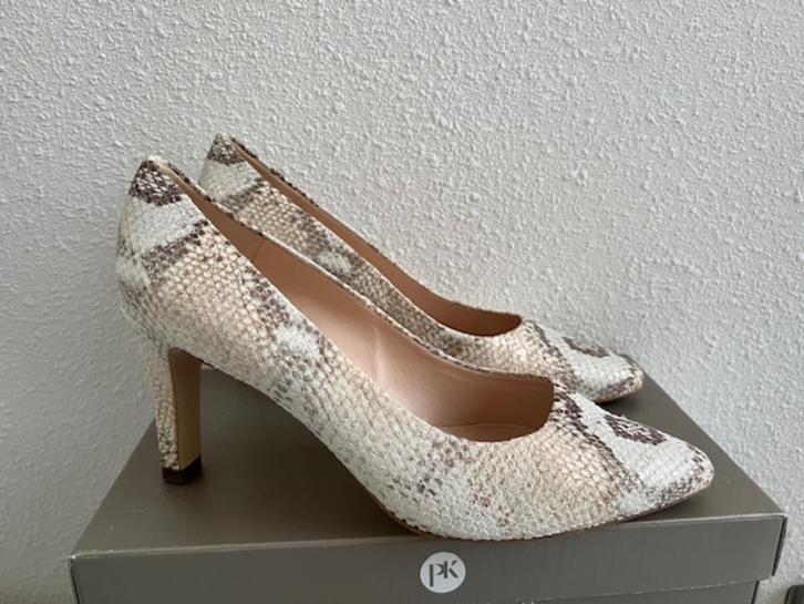 Prachtige pumps van Peter Kaiser met een prachtige python dessin en beige goud kleur. Deze pumps van Peter Kaiser hebben een hakhoogte van 8,5 cm. Volgens PK is dit 75 mm (staat op doos). Het materiaal is suede leer.