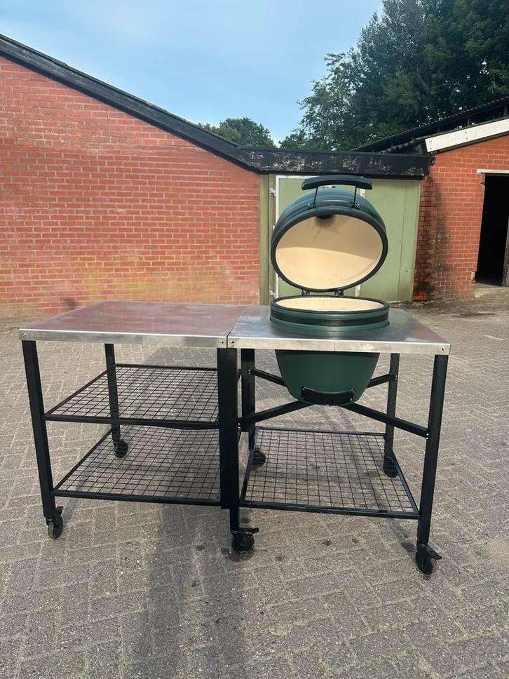 Kamado BBQ in uitstekende staat, geplaatst in een op maat gemaakte, verrijdbare werktafel met roestvrijstalen werkblad en stalen opbergrekken.